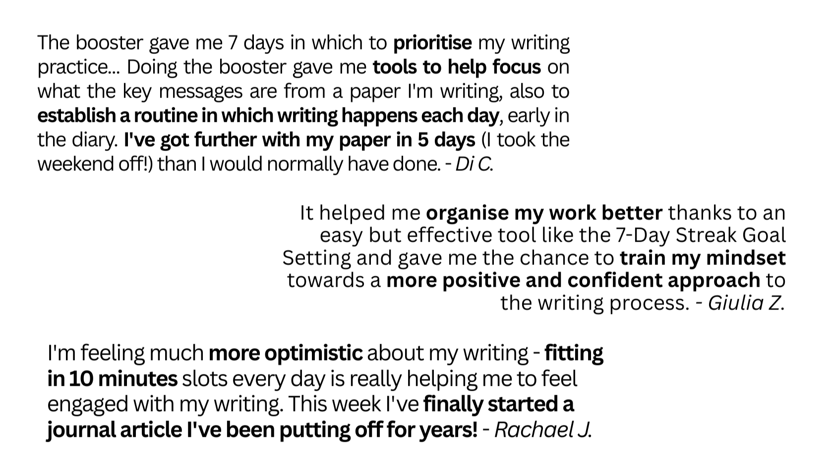 I was stuck with procrastination and finding the time to write among other commitments. The booster helped with work on my project every day, even just for 10 mins when really busy, as it gamified the process. It showed me that it's always possible to do a little bit, and your work is all the better for it afterwards!